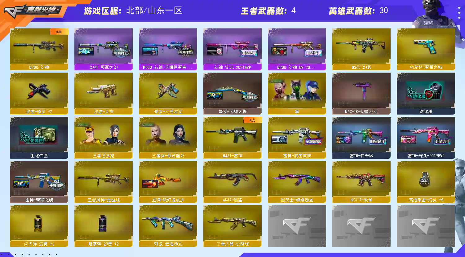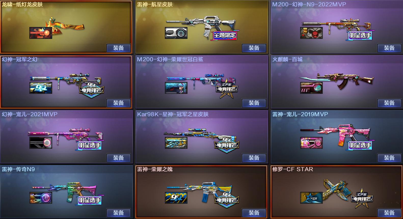 【武器皮肤】M200-幻神-荣耀世冠白鲨/M200-幻神-N9-2022MVP/幻神-宠儿-2021MVP/幻神-冠军之幻/雷神-航星皮肤/火麒麟-冠军之心/毁灭-黑大圣皮肤/Kar98K-星神-冠军之星皮肤/雷神-宠儿-2019MVP/雷神-传奇N9/雷神-荣耀之魄/火麒麟-百城/修罗-CFSTAR/屠龙-荣耀之锋/龙啸-纸灯龙皮肤