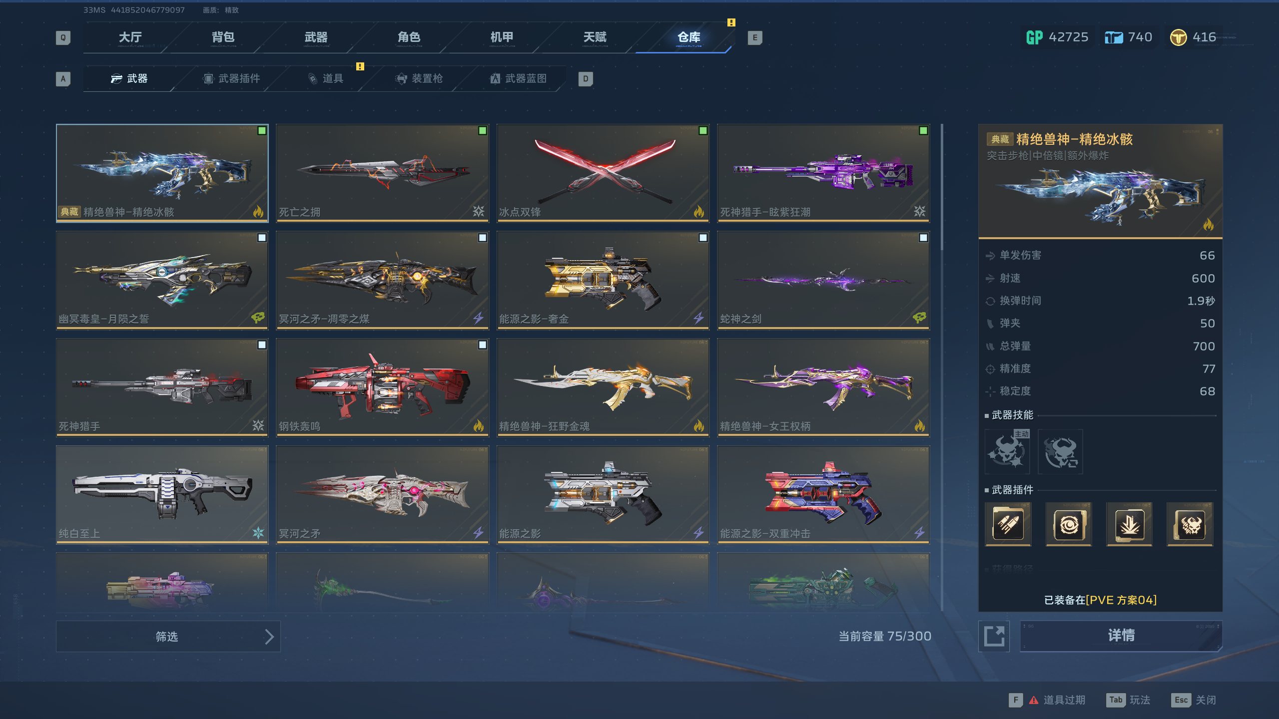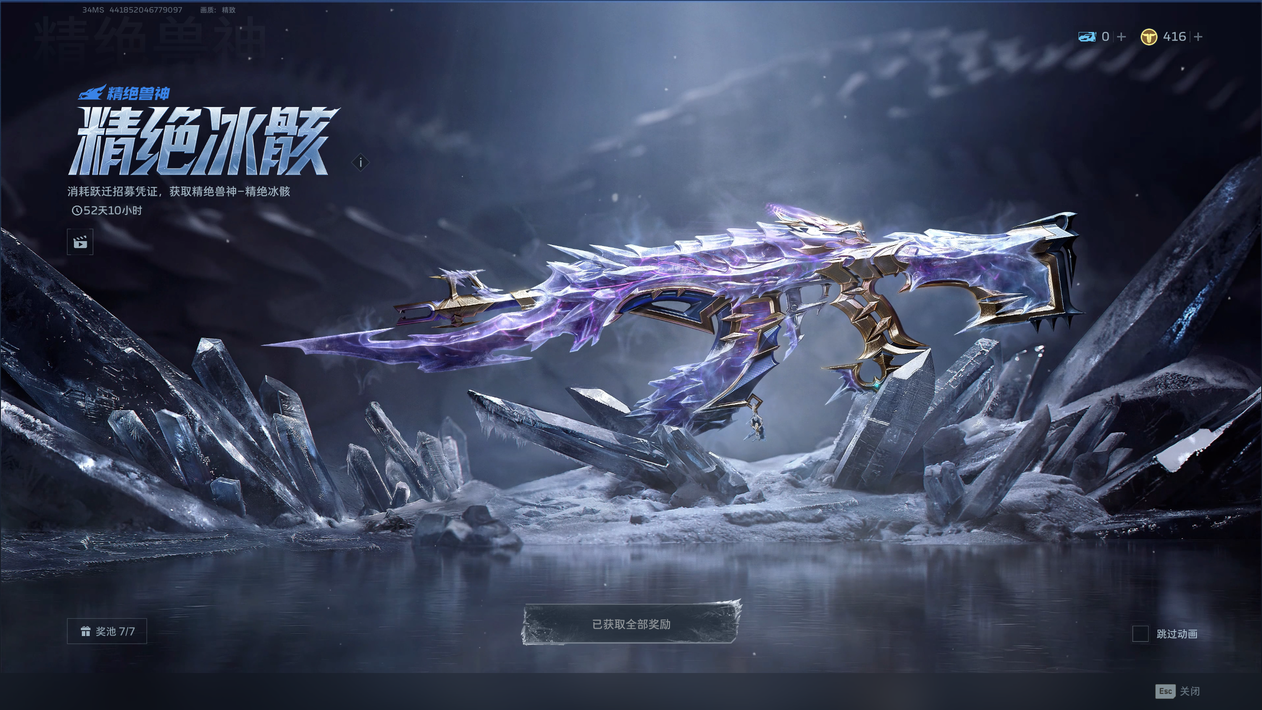 【武器】精绝兽神-精绝冰骸、死神猎手-眩紫狂潮、幽冥毒皇-月陨之誓、冥河之矛-凋零之煤、能源之影-奢金、死神猎手、钢铁轰鸣、精绝兽神-狂野金魂、精绝兽神-女王权柄、纯白至上、冥河之矛、能源之影、能源之影-双重冲击、战争矩阵-暮天流霞、鬼铜蚀、鬼铜蚀-逆火而上、春雷震、收割者、超级复合弓*2、苔色暴风、乘风快递-航迹、振弦、火山口*2、胜利誓约、Z型步枪、雷霆999、黄金Z型步枪、胜利誓约-绿潮、裁决之眼、死亡猎手-狩、飓风之锤、飓风之锤-沙漠涂装、沙丘之怒-红铁印记、黎明之光、黑克勒45*2、共晶点-野草*4、钢铁骑士、梦魇、雷霆之影、雷霆之影-金炼*2、生命线、生命线-冬日耀阳、生命线-蝶与寰宇、天鹅之舞、杜瓦瓶-白铃、维和者、铁砧、制式手枪