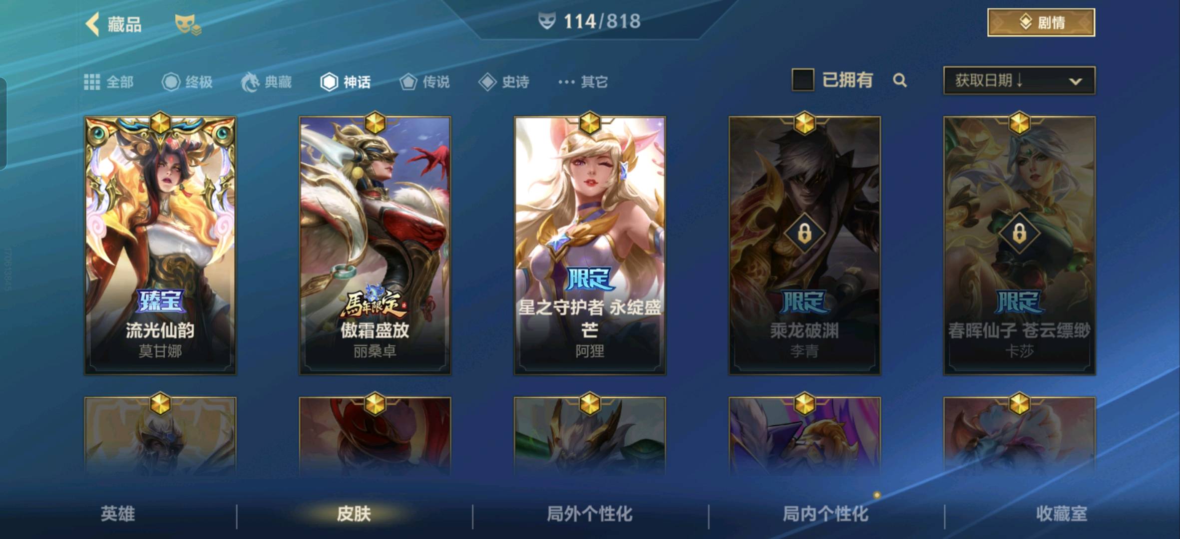 3神话❤️114皮肤❤️14传说❤️水晶腕豪❤️深海莫甘娜
