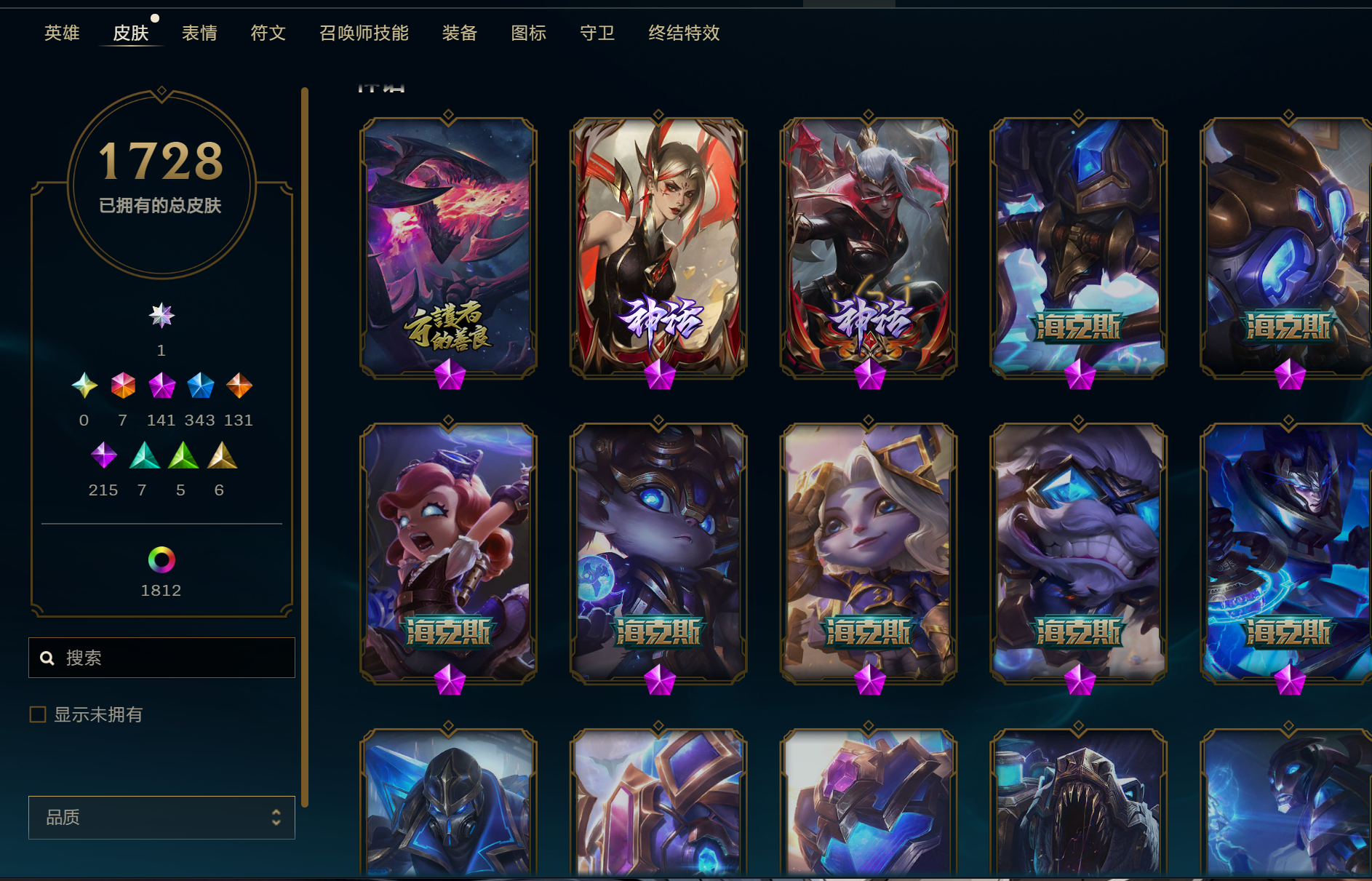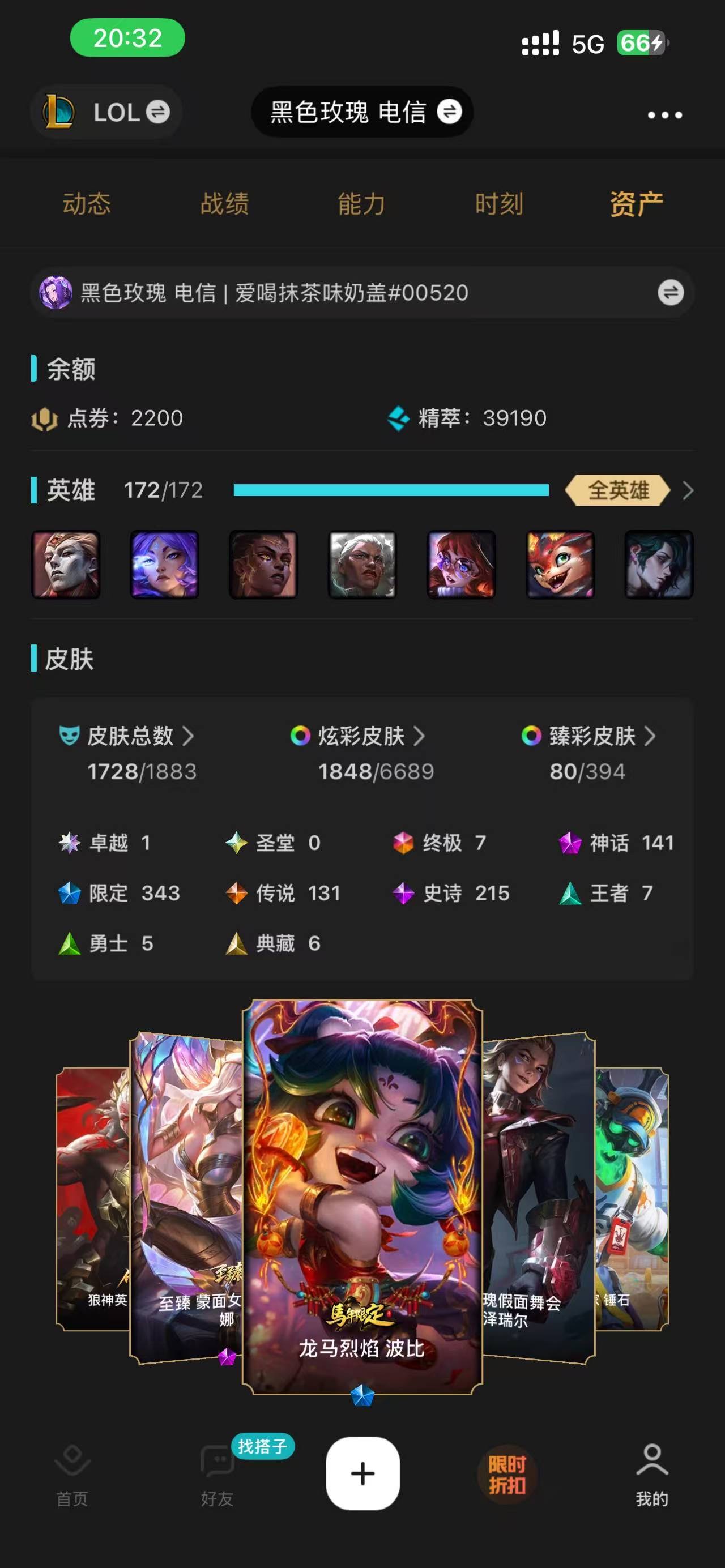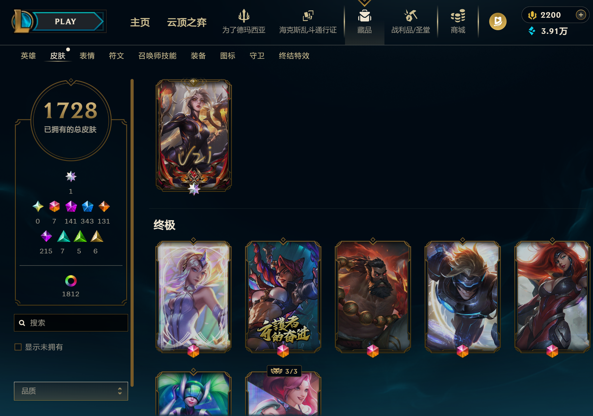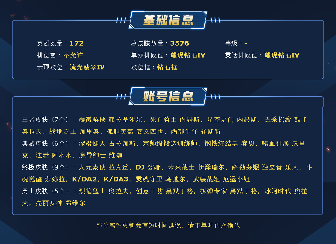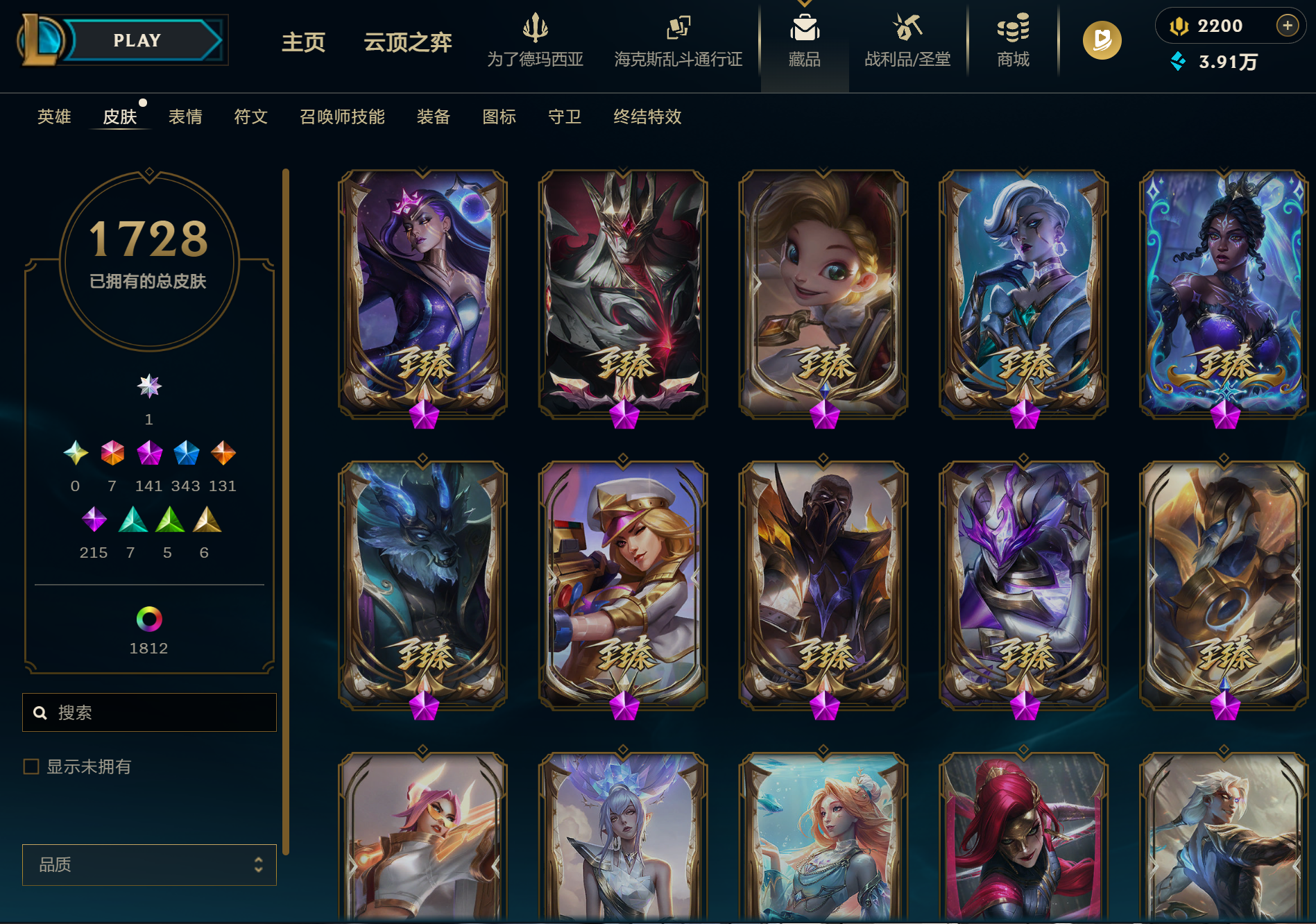 黑色全英雄原皮1728+炫彩1848+臻彩80不要动战利品,皮肤应有尽有。因某玩家恶意游戏不开放排位