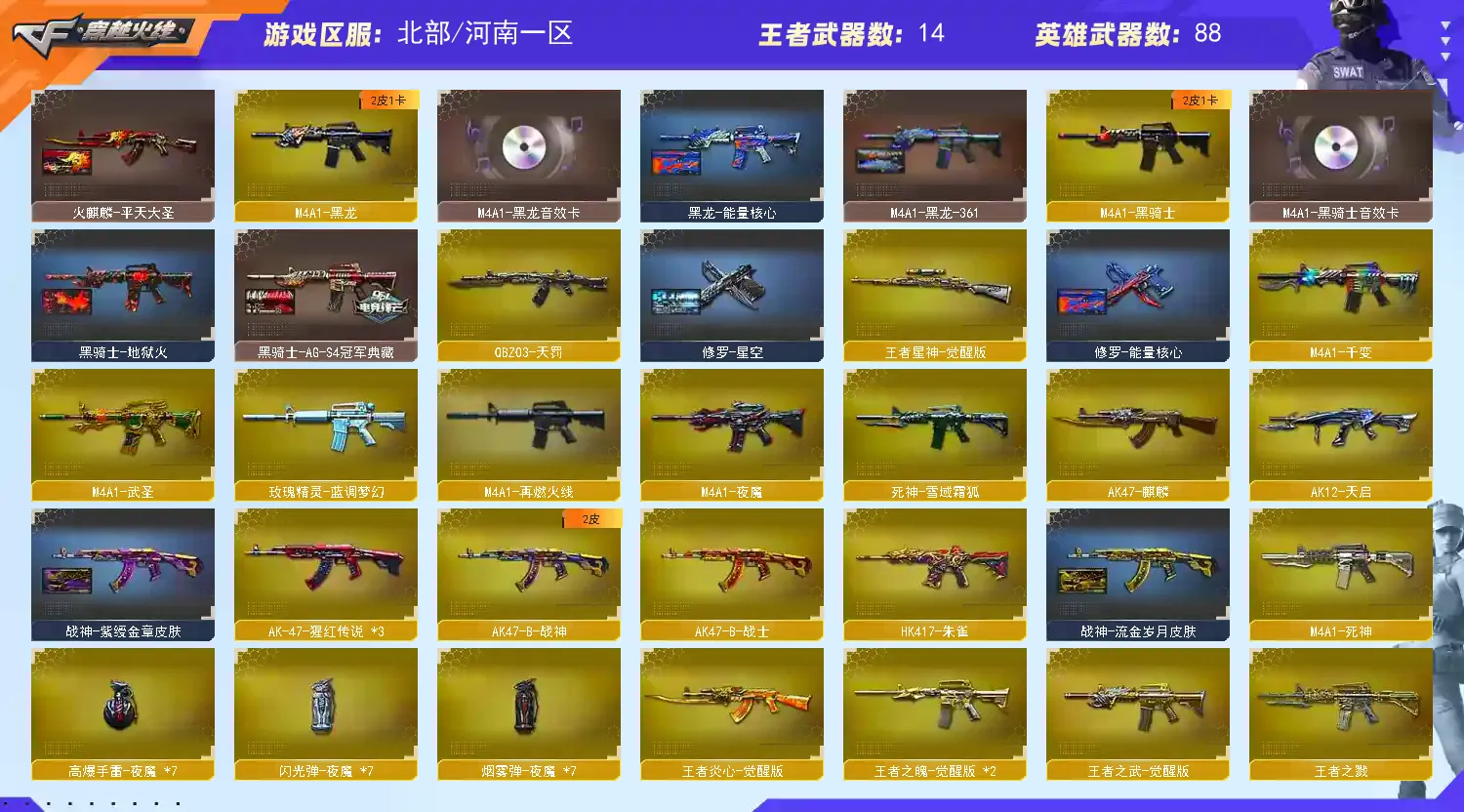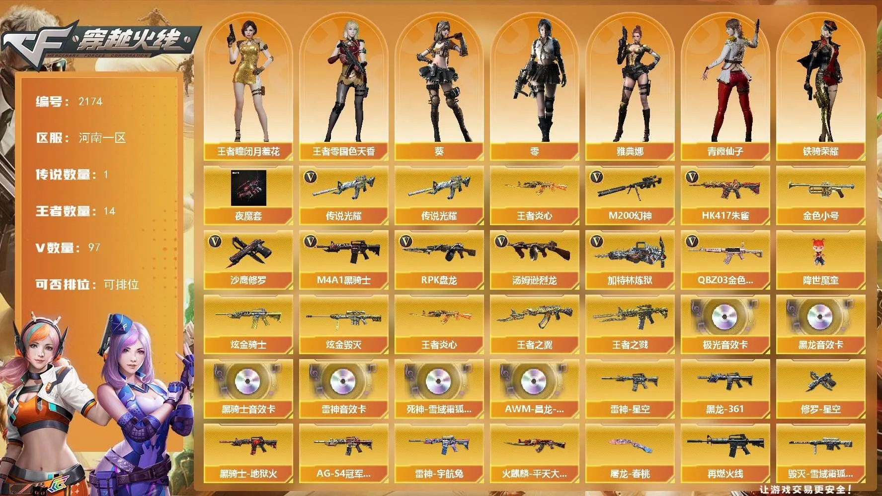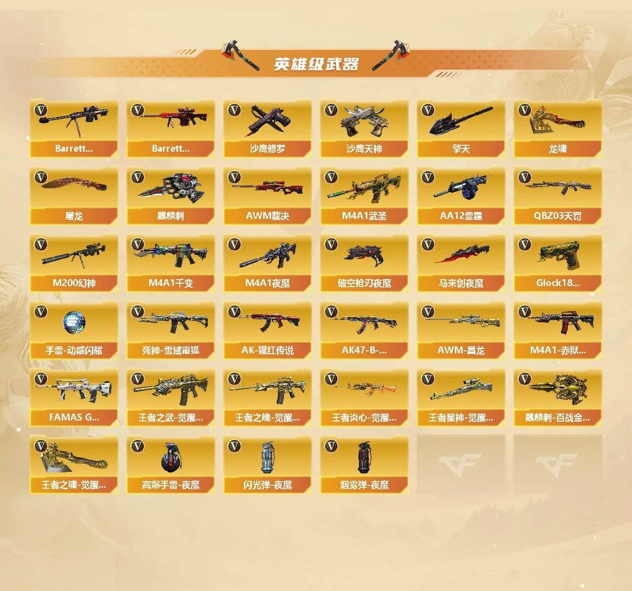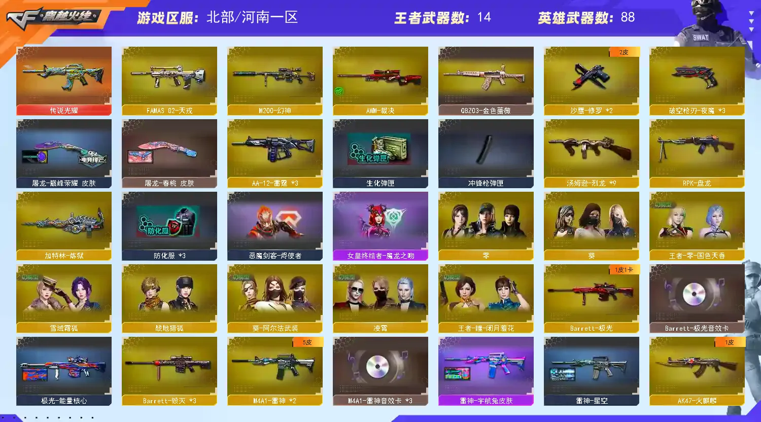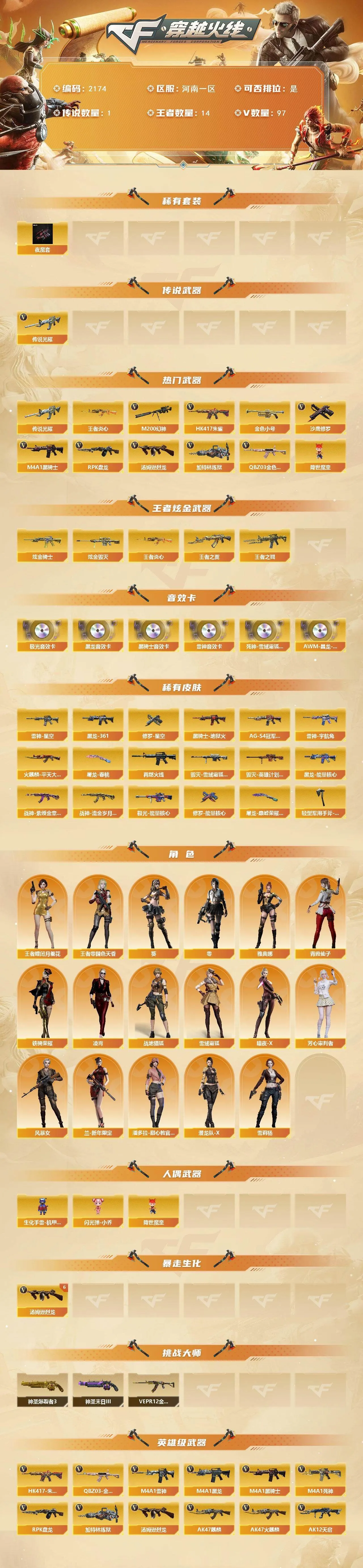 【传说武器】:传说光耀【热门武器】:传说光耀,QBZ03-金色蔷薇,HK417-朱雀,M200-幻神,王者炎心*3,金色小号,M4A1-黑骑士,汤姆逊-烈龙*9,RPK-盘龙,加特林-炼狱,降世魔童,沙鹰-修罗*2【王者炫金武器】:王者炎心*3,王者之戮,王者之翼,炫金骑士,炫金毁灭【音效卡】:M4A1-雷神音效卡*3,M4A1-黑龙音效卡,M4A1-黑骑士音效卡,Barrett-极光音效卡,死神-雪域霜狐-怀旧音效卡,AWM-昌龙-怀旧音效卡【皮肤】:雷神-星空,雷神-宇航兔皮肤,M4A1-再燃火线,火麒麟-平天大圣,毁灭-雪域霜狐 皮肤,毁灭-英雄计划 皮肤,黑龙-能量核心,M4A1-黑龙-361,黑骑士-地狱火,黑骑士-AG-S4冠军典藏,战神-紫绶金章皮肤,战神-流金岁月皮肤,极光-能量核心,修罗-能量核心,修罗-星空,屠龙-春桃 皮肤,屠龙-巅峰荣耀 皮肤,轻型军用手斧-再燃火线【角色】:零,葵,凌霄,战地猎狐,王者-瞳-闭月羞花,王者-零-国色天香,雪域霜狐,暗夜-X,芳心审判者,风暴女,兰-新年限定,潘多拉-甜心教官,潜龙队-X,青霞仙子,铁骑荣耀,雪莉杨,雅典娜【人偶武器】:生化手雷-机甲核心*2,闪光弹-小乔,降世魔童【挑战大师】:神圣爆裂者III*2,VEPR-12-金魔,神圣爆裂者-末日III【英雄级武器】:M4A1-千变,AK47-火麒麟,AK47-麒麟,M4A1-黑龙,M4A1-雷神*2,M4A1-黑骑士,M4A1-死神,AK12-天启,M4A1-武圣,HK417-朱雀,M4A1-夜魔,QBZ03-天罚,FAMAS G2-天戎,死神-雪域霜狐,QBZ03-金色蔷薇,王者之武-觉醒版,王者之魄-觉醒版*2,AK-47-猩红传说*3,AK47-B-战神,王者炎心-觉醒版,Barrett-毁灭*3,Barrett-极光,AWM-裁决,M200-幻神,王者星神-觉醒版,RPK-盘龙,加特林-炼狱,汤姆逊-烈龙*9,AA-12-雷霆*3,沙鹰-修罗*2,沙鹰-天神*4,破空枪刃-夜魔*3,Glock18-武圣,屠龙,龙啸,马来剑-夜魔,擎天,麒麟刺,麒麟刺-百战金芒,王者之啸-觉醒版*4,高爆手雷-夜魔*7,手雷-动感闪耀,闪光弹-夜魔*7,烟雾弹-夜魔*7,M4A1-赤狱骑士,AWM-昌龙【道具】:云山科技背包,冰冰背包-猛男专用,炫彩背包,百战金芒炫彩背包,背包-洛丽塔,超级背包,雪域霜狐炫彩背包,女皇终结者-魔龙之吻,救世主-黑桃战神,黄金生化钩,绿色巨人,灵魂忍者,迷雾幽灵*2,夺命之镰,防化服*3,星辰流光-枪王排位,流光-鎏金之域,枪王排位29赛季金色流光,语音特效-怀旧,雪域霜狐表情,萌萌小葵表情,EP战队名片,C4-红龙,防弹头盔*6,防弹衣*7,C4工具钳*5,手雷包*4【特殊枪械】:1黑骑士,6烈龙,1盘龙,1炼狱【稀有套装】:夜魔套,