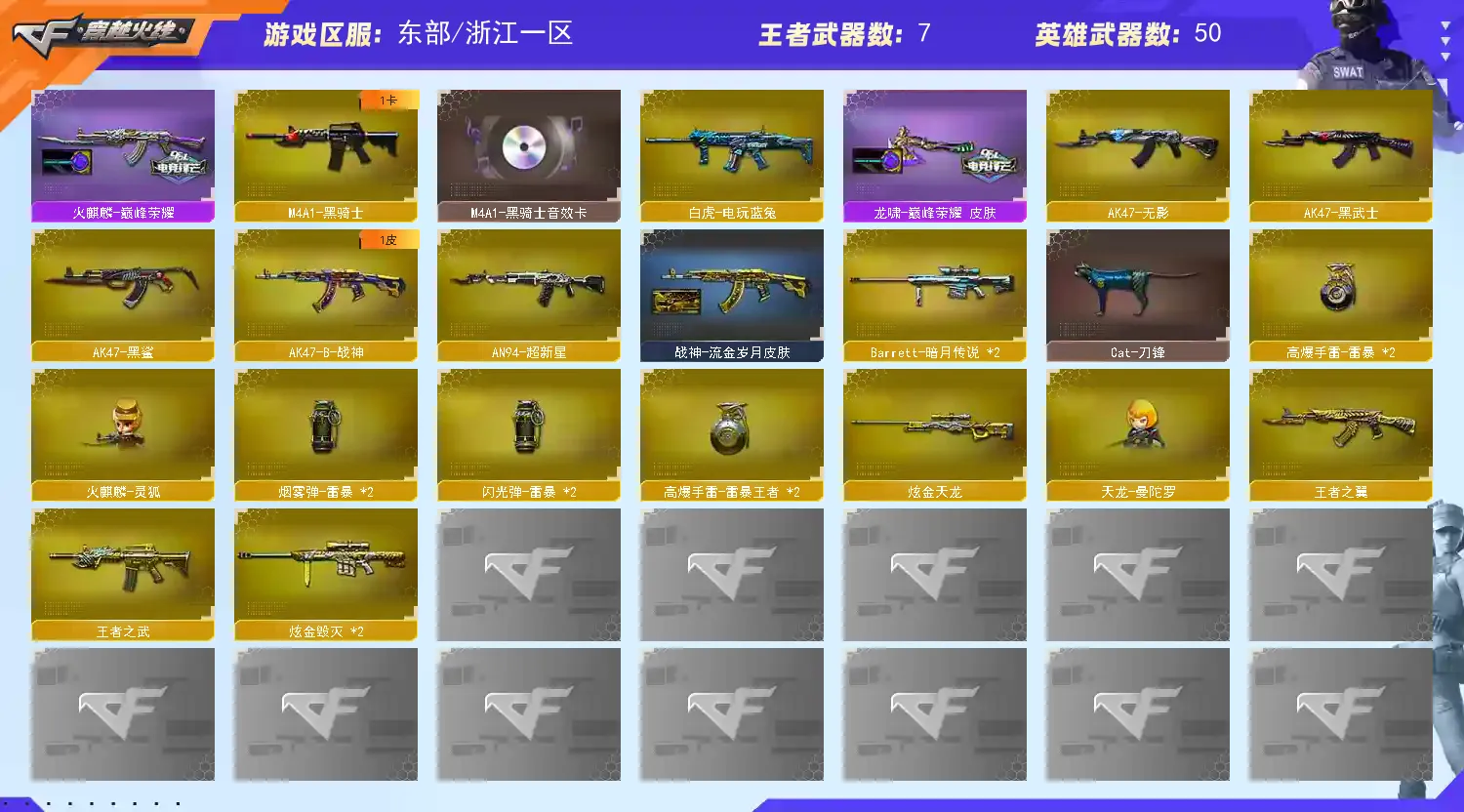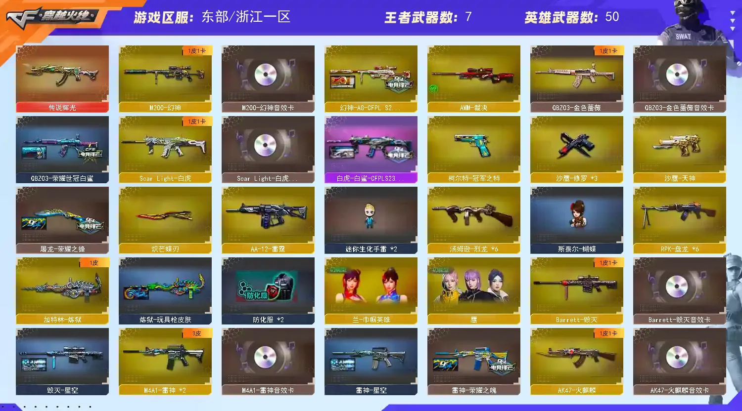 【亮点解析 幻神三件套 白虎三件套 生化满配】【m200幻神+幻神音效卡+ag24冠军 +冠军之特】【6盘龙 炼狱 6烈龙 炽芒蝶刃 斯太尔蝴蝶 】【传说辉光 】【scar白虎+白虎音效卡 +白鲨冠军】【qbz金色蔷薇+卡+荣耀世冠白鲨】【火麒麟+卡+巅峰荣耀】【雷神+卡+荣耀之魄】【黑骑士+卡】【毁灭+卡】【裁决 】【武器:白虎电玩】【5手枪:修罗*3 天神 冠军之特】【7刀具:屠龙 龙啸 麒麟刺*2 斩神刀雷暴 】【雷套:雷暴雷*2】【小人枪:火麒麟灵狐 天龙曼陀罗 】【音效卡:幻神音效卡 白虎音效卡 金色蔷薇音效卡 毁灭音效卡 雷神音效卡 火麒麟音效卡 黑骑士音效卡 】【角色:兰巾帼英雄 鹰 】