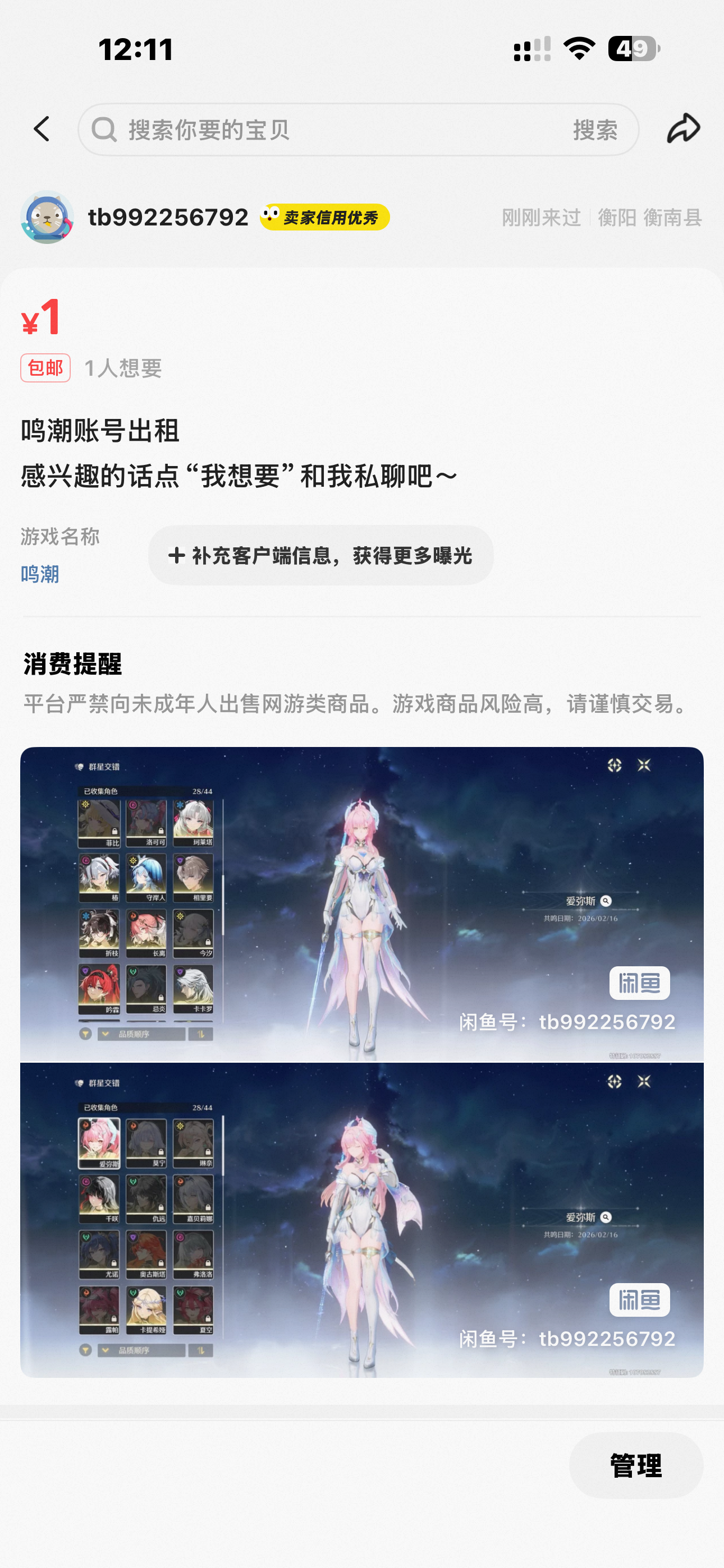 鸣潮4命长离配2命装武闲鱼上面去拍