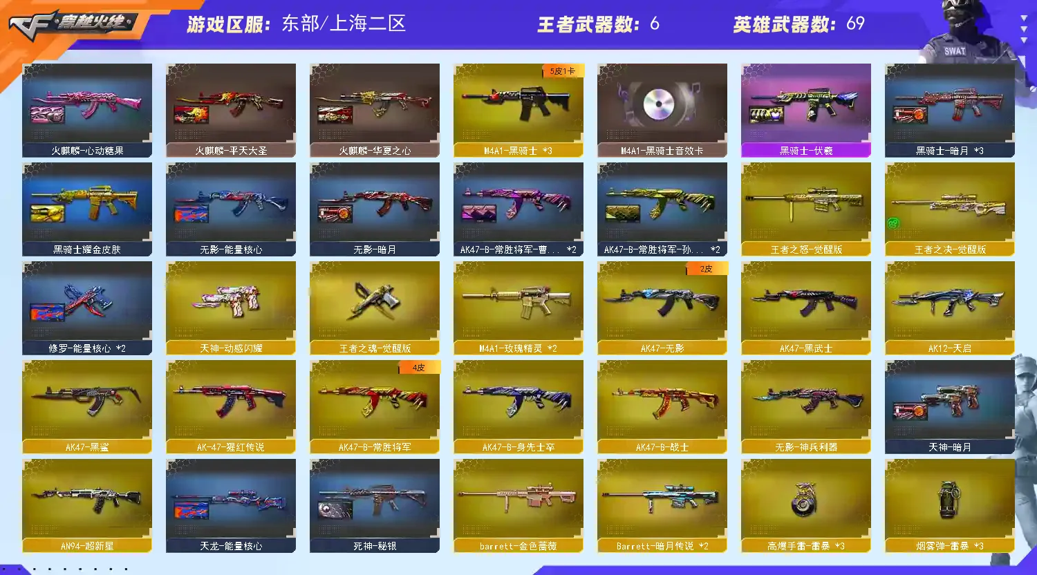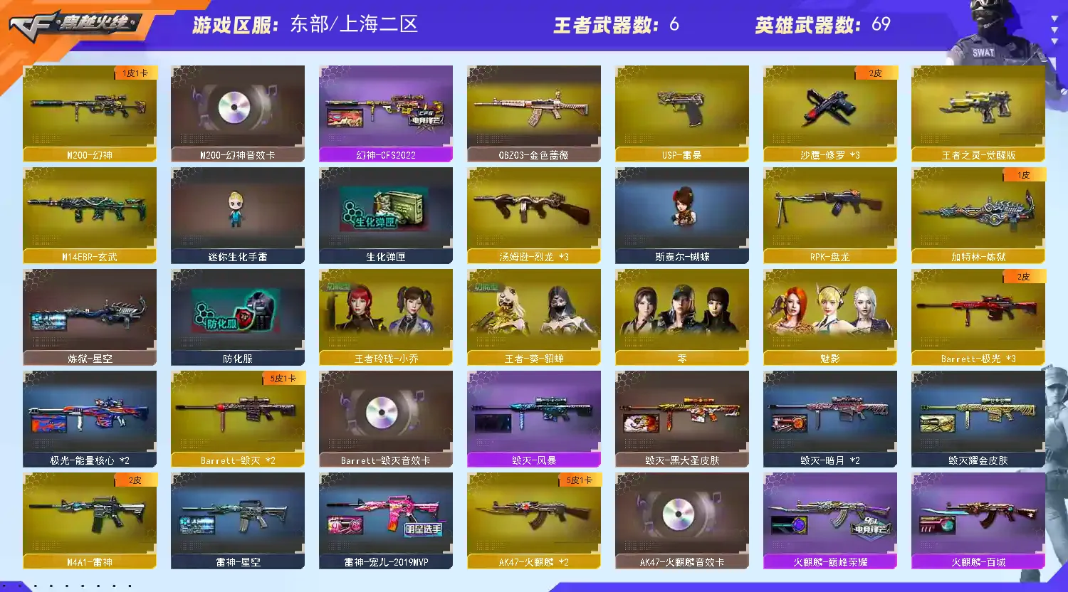 【亮点解析 幻神三件套】【M200-幻神+音效卡+幻神-CFS2022】【生化 盘龙 炼狱 3烈龙 蝴蝶 死亡之眼】【裁决】【Barrett-毁灭+音效卡】【极光】【AK47-火麒麟+音效卡】【M4A1-雷神+雷神-宠儿】【黑骑士+音效卡+白马银枪】【王者之怒 王者之力 王者之决】【无影 死神 黑武士 天启 超新星 黑鲨 龙血 玄武 玫瑰精灵】【8手枪 修罗*3 天神 usp雷暴 王者之魂 王者之灵】【11近战 屠龙*3 龙啸*3 擎天 麒麟刺 斩神刀雷暴 王者之锋】【手雷 雷暴雷】【四防 王者葵貂蝉 王者玲珑小乔】【幻神音效卡 AK47-火麒麟音效卡】