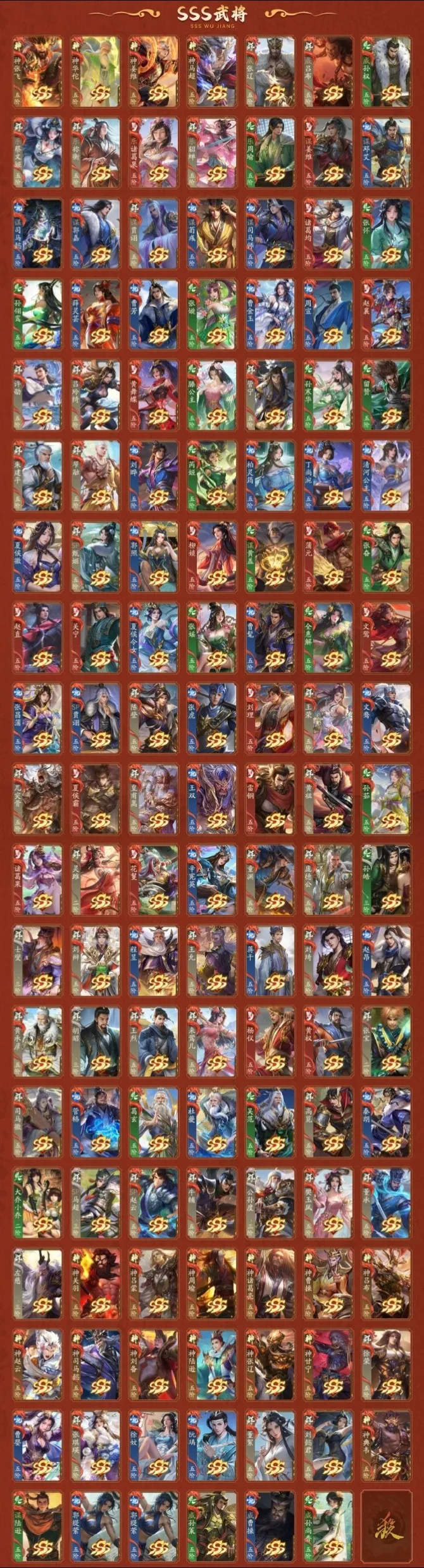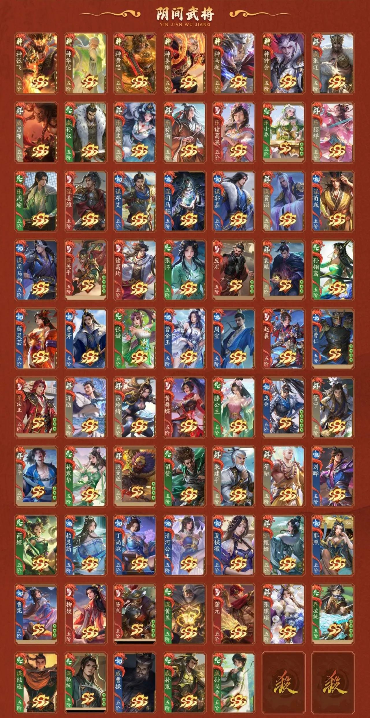 阴间将:神张飞/神华佗/神黄忠/神姜维/神马超/神钟会/威张辽/威吕布/威孙权/乐蔡文姬/乐祢衡/乐诸葛果/乐小乔/乐貂蝉/乐周瑜/谋姜维/谋邓艾/谋司马懿/谋郭嘉/谋贾诩/谋荀彧/谋司马师/谋关平/诸葛均/张怀/庞宏/袁胤/孙翎鸾/薛灵**/曹芳/张嫙/曹金玉/周宣/赵襄/星曹仁/星法正/许劭/吕玲绮/黄舞蝶/滕公主/庞会/管宁/吉平/孙寒华/张曼成/留赞/朱建平/笮融/刘晔/芮姬/柏灵筠/丁尚涴/清河公主/夏侯徽/SP甄姬/郭照/曹宪/柳婒/陈式/谋黄盖/蒲元/张琪瑛/界凌统/谋陆逊/谋骆统/威曹操/威孙策/威孙尚香
