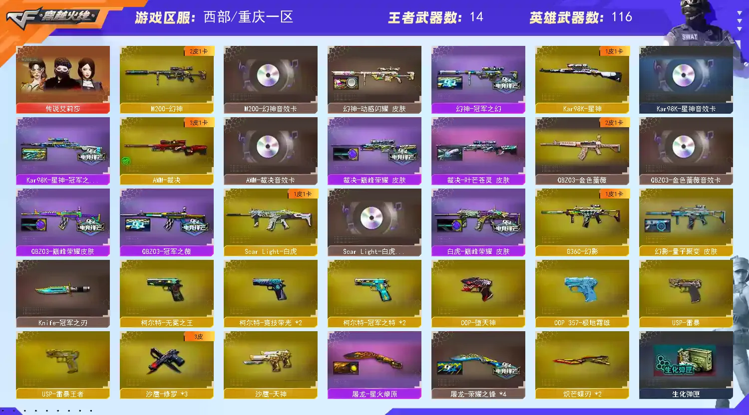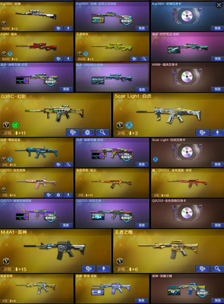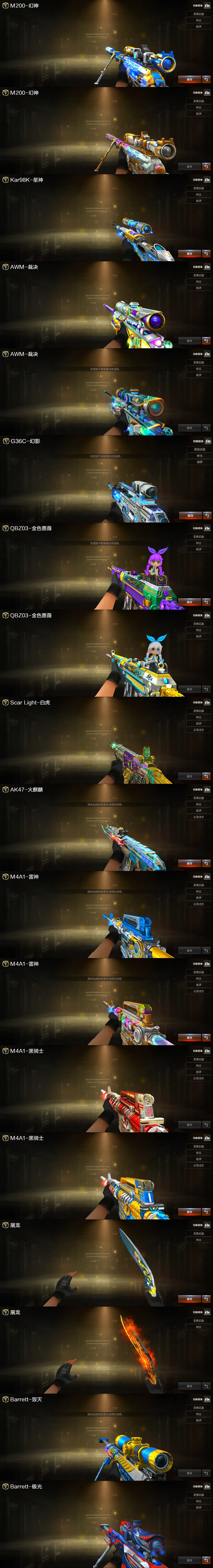 【稀有武器】:M200-幻神/Kar98K-星神/G36C-幻影/ScarLight-白虎/USP-雷暴/COP-堕天神/柯尔特-竞技荣光(2)/天神-动感闪耀/柯尔特-无冕之王/修罗-古蛇迷踪/柯尔特-冠军之特(2)/金色蔷薇-古蛇迷踪/QBZ03-金色蔷薇/AK47-火麒麟(3)/M4A1-黑龙/M4A1-雷神/M4A1-黑骑士/AK47-黑武士/白虎-电玩蓝兔/Barrett-毁灭(3)/Barrett-极光/AWM-裁决/M200-竞技荣光/加特林-炼狱/汤姆逊-烈龙(5)/炽芒蝶刃(2)/马来剑-夜魔/擎天-竞技荣光