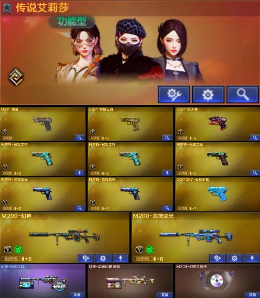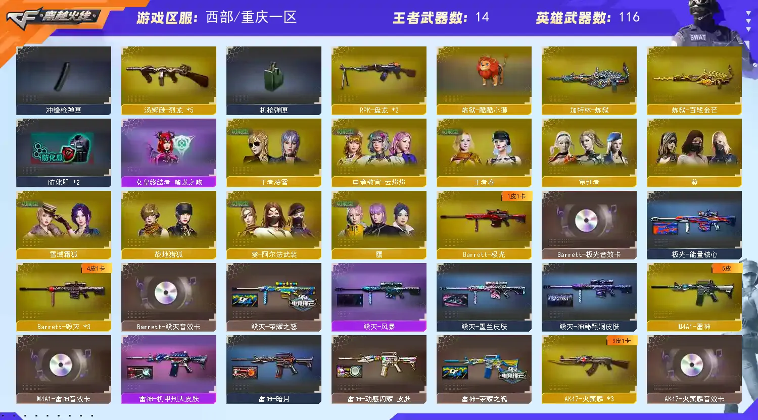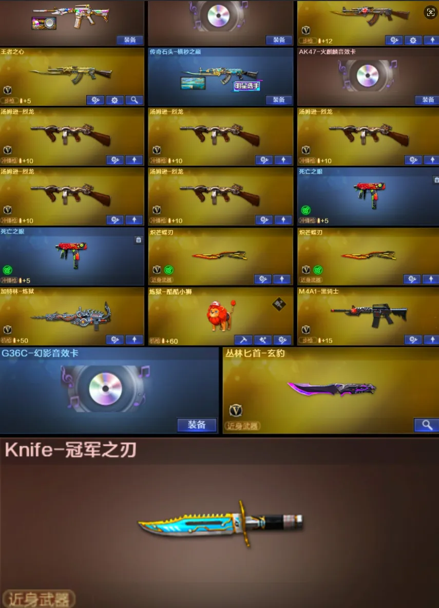 【稀有武器】:M200-幻神/Kar98K-星神/G36C-幻影/ScarLight-白虎/USP-雷暴/COP-堕天神/柯尔特-竞技荣光(2)/天神-动感闪耀/柯尔特-无冕之王/修罗-古蛇迷踪/柯尔特-冠军之特(2)/金色蔷薇-古蛇迷踪/QBZ03-金色蔷薇/AK47-火麒麟(3)/M4A1-黑龙/M4A1-雷神/M4A1-黑骑士/AK47-黑武士/白虎-电玩蓝兔/Barrett-毁灭(3)/Barrett-极光/AWM-裁决/M200-竞技荣光/加特林-炼狱/汤姆逊-烈龙(5)/炽芒蝶刃(2)/马来剑-夜魔/擎天-竞技荣光