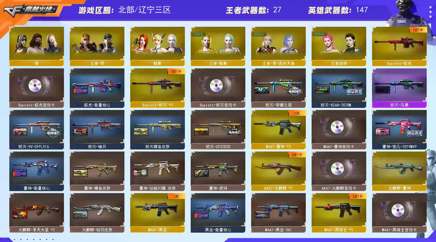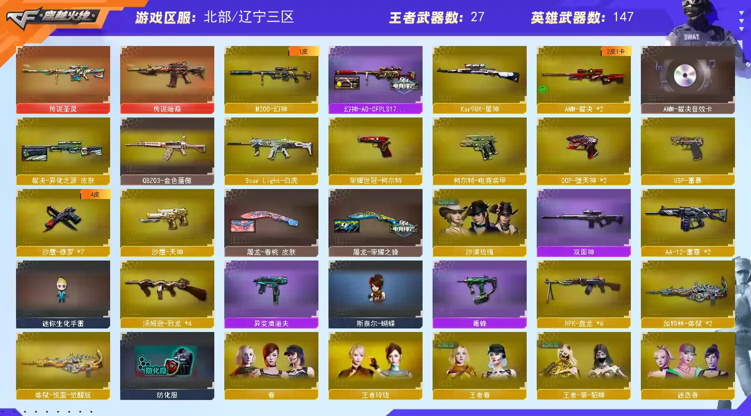 裁决三件套】【M200-幻神+幻神-AG-CFPLS17】【Kar98K-星神】【王者幻神】【传说圣灵】【传说暗裔】【ScarLight-白虎】【QBZ03-金色蔷薇】【生化 6盘龙 3炼狱 6烈龙 毒蜂 异变清道夫 擎天柱 蝴蝶 死亡之眼】【裁决+音效卡+裁决-异化之源】【Barrett-毁灭+音效卡+毁灭-荣耀之怒】【极光+音效卡】【雷暴套】【堕天神套】【AK47-火麒麟+音效卡】【黑龙】【M4A1-雷神+音效卡+雷神-宠儿】【5黑骑士+音效卡+白马银枪】【王者之心 王者之影 王者之势 王者之武 王者炎心 王者冰魄 王者之怒】【无影 死神 黑武士 天启 超新星 黑鲨 龙血 青龙 hk417-朱雀】【15手枪 修罗*7 天神 usp雷暴 cop堕天神*2 荣耀世冠-柯尔特】【29近战 屠龙*4 龙啸*2 擎天 麒麟刺*5 斩神刀雷暴 幻灵之锋 王者之锋*2 王者之啸*2 王者之击*2 王者之刺 】【手雷 雷暴雷 堕天神 夜魔雷 电竞装甲 幻灵雷】【四防 沙漠玫瑰 王者春 王者葵貂蝉 王者零国色天香 王者魅影 王者涂鸦 职业经理