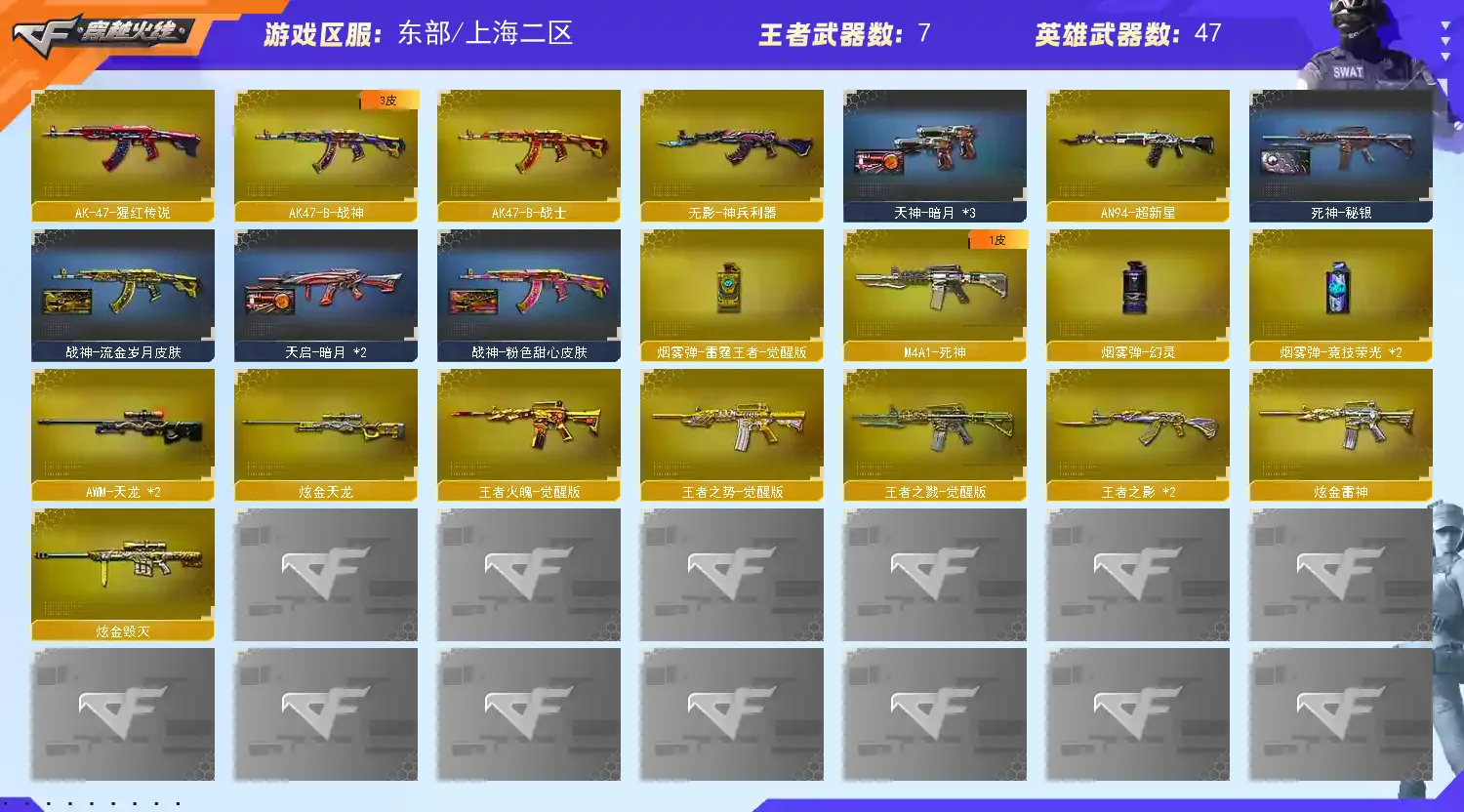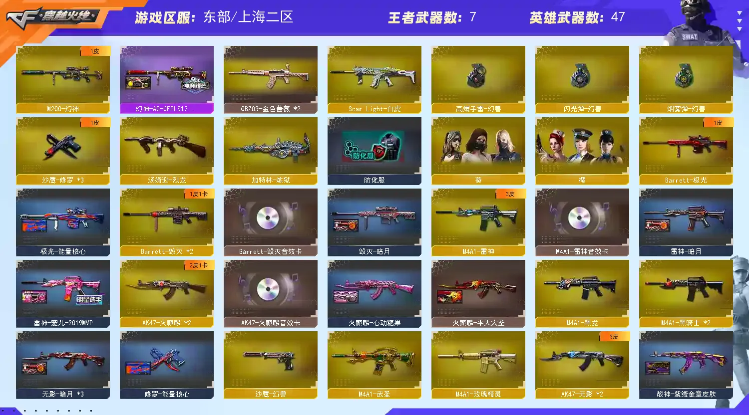 【m200幻神+ag冠军皮肤】【白虎】【qbz03金色蔷薇*2】【雷神+雷神音效卡+宠儿皮肤】【毁灭+毁灭音效卡】【火麒麟+火麒麟音效卡】【王者火魄 王者之影 王者之戮 王者之势】【无影 战神 超新星 黑龙 黑骑士 玫瑰精灵 死神 武圣 无影神兵利器 天龙 极光 炼狱 烈龙 】——【热门武器/小人呛】【金刚伞 海滩汪汪芭蕾特】——【沙鹰幻兽 天神 修罗*3】——【龙啸 女皇利刃幻兽 麒麟刺 擎天 屠龙 王者之锋】——【幻兽投掷武器套装】——【角色】【4防灵狐者职业经理】【葵 樱】