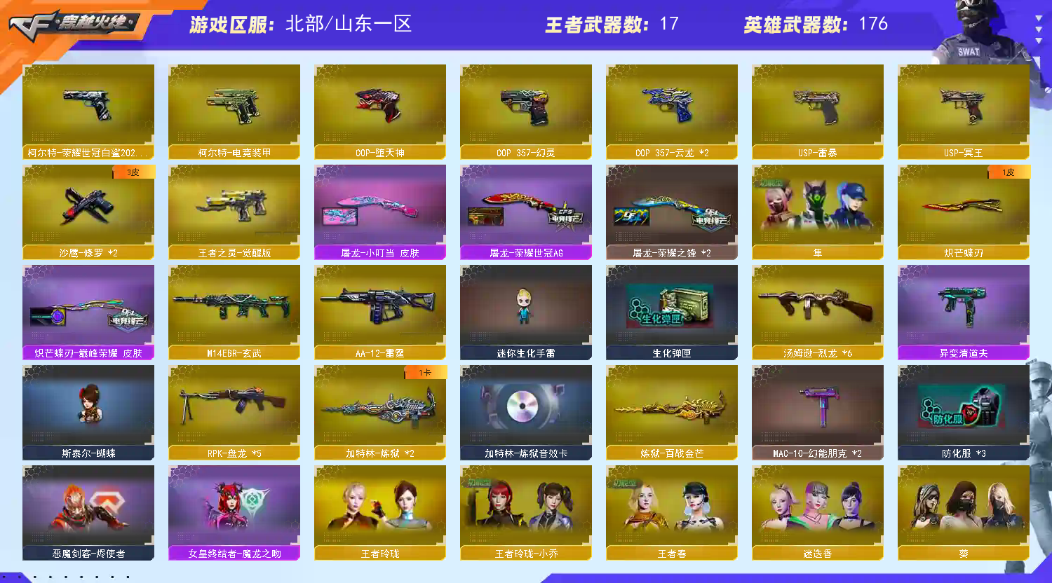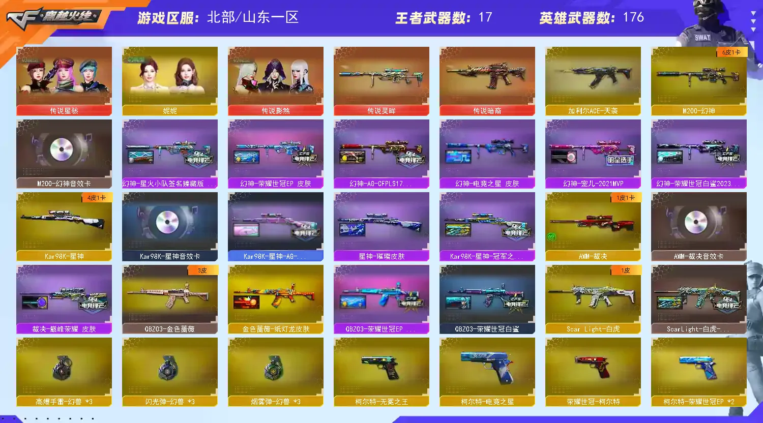 【山东一区】【V武器数188】【幻神三件套】【幻神4皮】【星神三件套】【6烈龙】【异变清道夫】【斯泰尔-蝴蝶】【死亡之眼】【云龙套装X1套】【雷暴套装X4套】【夜魔套装X2套】【堕天神套装X6套】【堕天神套装X6套】【幻兽套装X3套】【传说星骇】【传说影煞】【传说灵眸】【传说暗裔】【QBZ95-幻兽】【沙鹰-幻兽】【高爆手雷-幻兽】【闪光弹-幻兽】【烟雾弹-幻兽】【M200-幻神】【幻神-荣耀世冠EP 皮肤】【幻神-荣耀世冠白鲨2023 皮肤】【幻神-星火小队签名臻藏版 皮肤】【幻神-宠儿-2021MVP】【幻神-AG-CFPLS17冠军】【M200-幻神音效卡】【王者幻神-觉醒版】【Kar98K-星神】【星神-拼搏 皮肤】【Kar98K-星神-冠军之星皮肤】【Kar98K-星神-AG-CFPLS21冠军皮肤】【星神-璀璨皮肤】【Kar98K-星神音效卡】【AWM-裁决】【AWM-裁决音效卡】【裁决-巅峰荣耀 皮肤】【Scar Light-白虎】【ScarLight-白虎-冠军之虎皮肤】【白虎之魄-觉醒版】【QBZ03-金色蔷薇】【QBZ03-荣耀世冠白鲨】【金色蔷薇-纸灯龙皮肤】【QBZ03-云龙】【加利尔ACE-天袭】【HK417-朱雀】【M14EBR-玄武】【M4A1-堕天神】【柯尔特-荣耀世冠白鲨2023】【USP-雷暴】【USP-冥王】【柯尔特-无冕之王】【荣耀世冠-柯尔特】【沙鹰-幻兽】【COP 357-幻灵】【COP-堕天神】【COP 357-云龙】【炽芒蝶刃】【炽芒蝶刃-巅峰荣耀 皮肤】【黄金猫猫手套-白鲨】【加特林-炼狱】【RPK-盘龙】【炼狱-百战金芒】【汤姆逊-烈龙】【烈龙-云海游龙】【斯泰尔-蝴蝶】【异变清道夫】【死亡之眼】【传说星骇】【传说影煞】【妮妮】【机械姬】【葵】【迷迭香】【奇洋探员】【乔伊教练】【蛇隐宗】【王者春】【王者炽天使】【王者玲珑】【王者玲珑-小乔】【鹰】【云海玲珑】【隼】【M4A1-雷神】【雷神-荣耀之魄】【M4A1-雷神-白鲨皮肤】【雷神-传奇N9】【雷神-杨戬】【雷神-CFS十周年纪念版 皮肤】【雷神-耀金皮肤】【雷神-暗月】【雷神-源计划2.0专属 皮肤】【M4A1-雷神音效卡】【AK47-火麒麟】【AK47-火麒麟-传奇EVEN】【火麒麟-轻羽皮肤】【火麒麟-平天大圣】【火麒麟-CFSTAR】【AK47-火麒麟音效卡】【M4A1-黑骑士】【黑骑士-地狱火】【黑骑士-CFS2021】【黑骑士-暗月】【黑骑士-破界 皮肤】【M4A1-黑骑士音效卡】【M4A1-黑龙】【黑龙-墨子皮肤】【M4A1-黑龙-361】【Barrett-毁灭】【毁灭-BEAN-2020MVP】【毁灭-战神张飞】【毁灭-百城浙江 皮肤】【Barrett-毁灭音效卡】