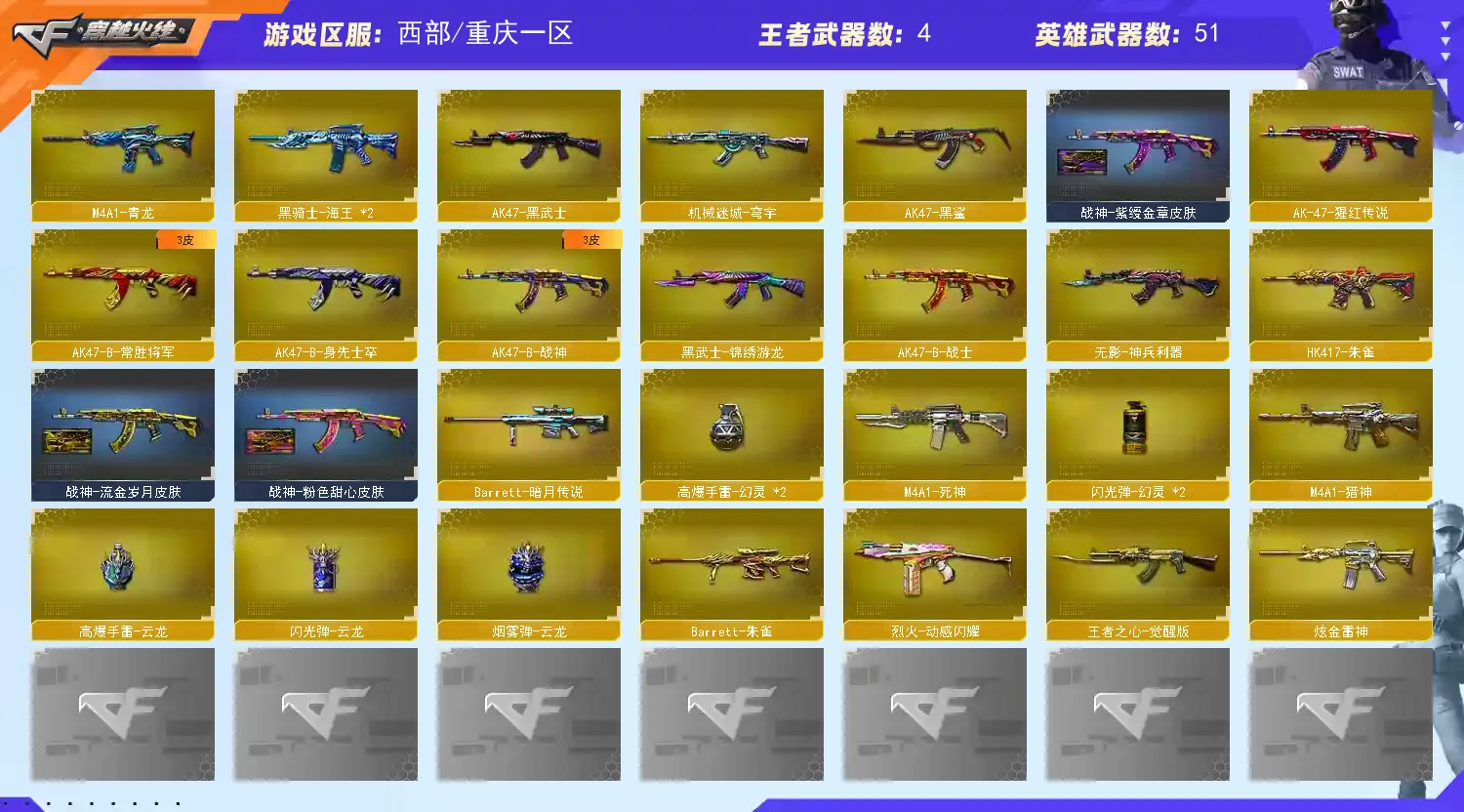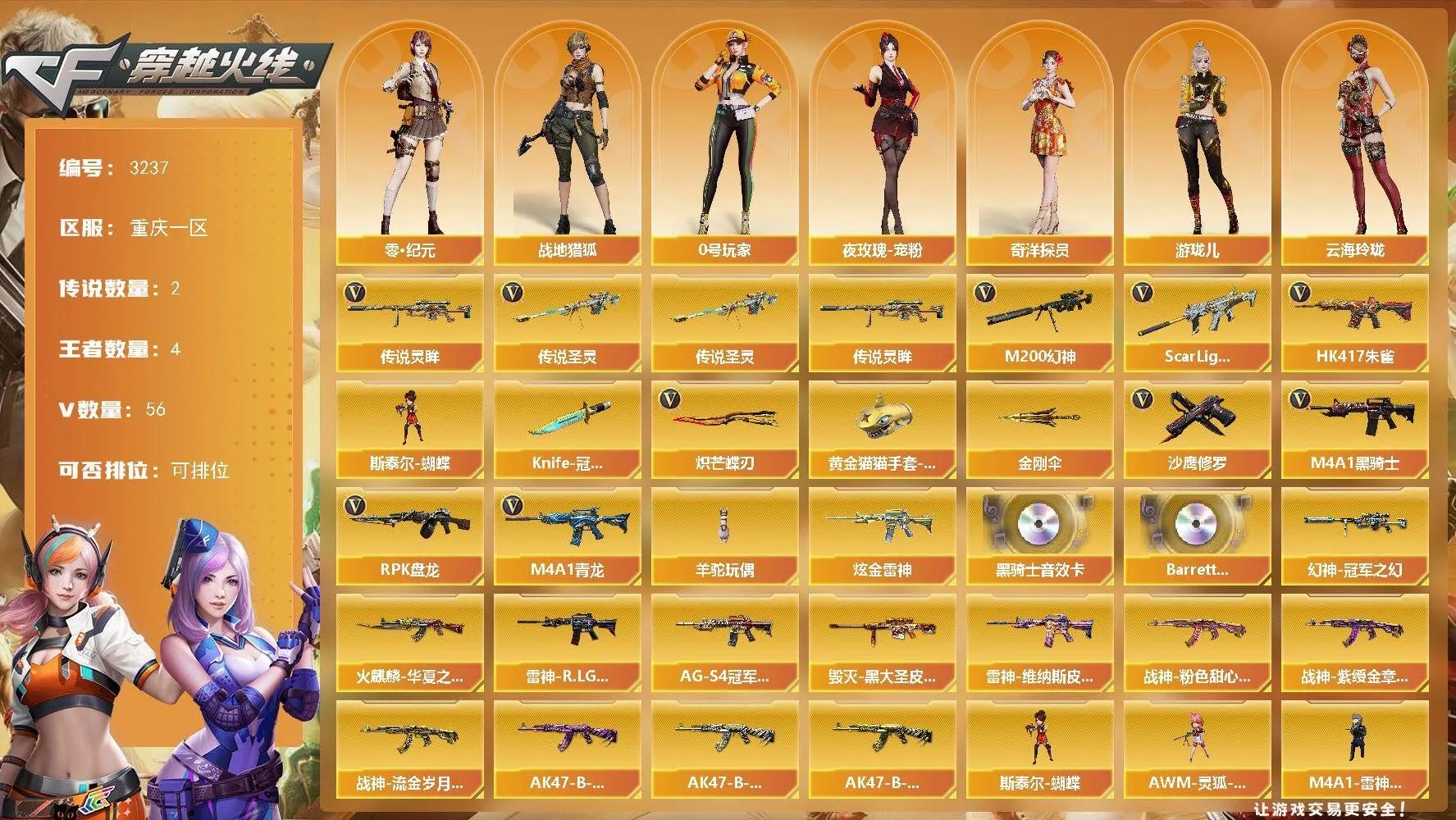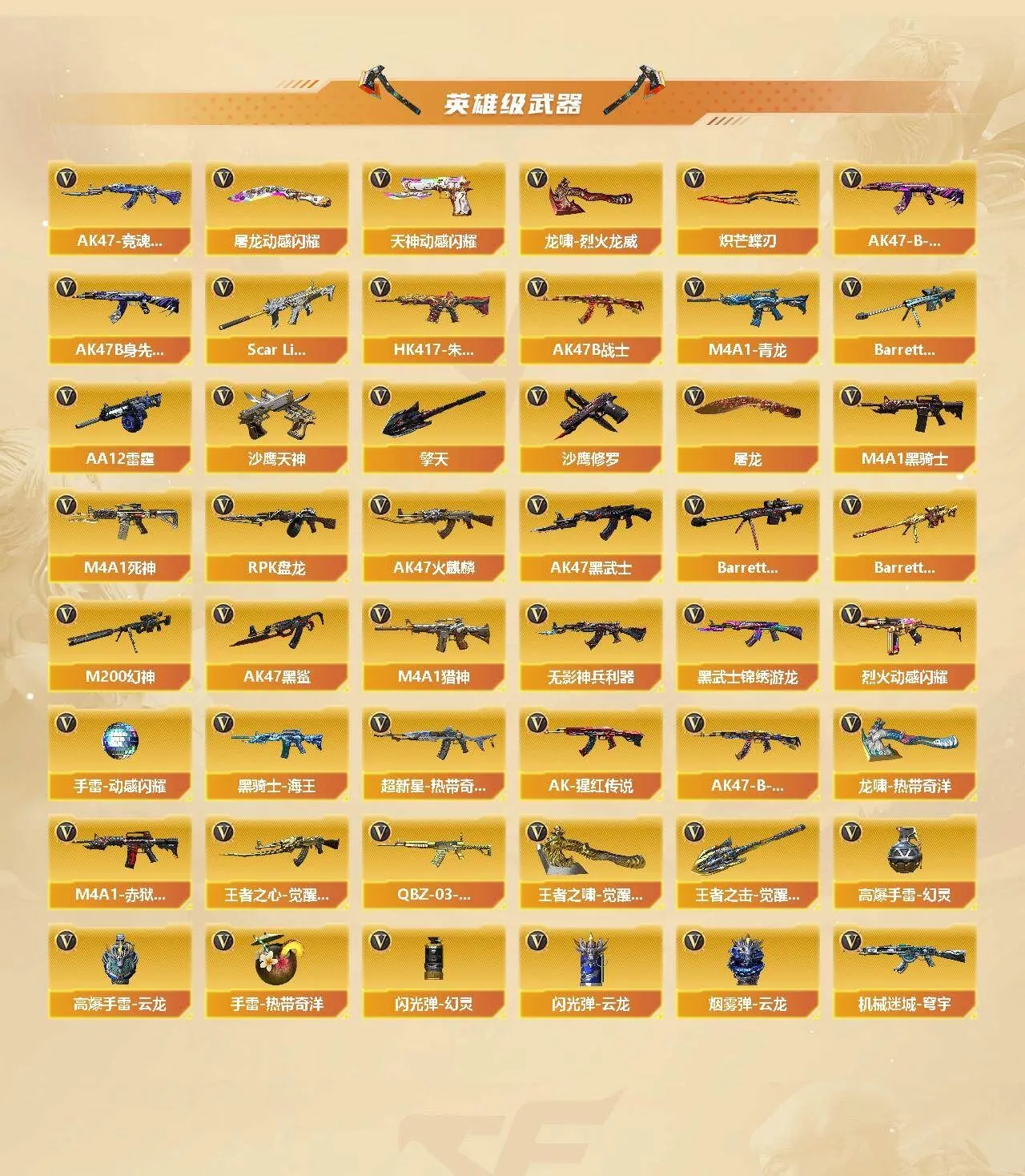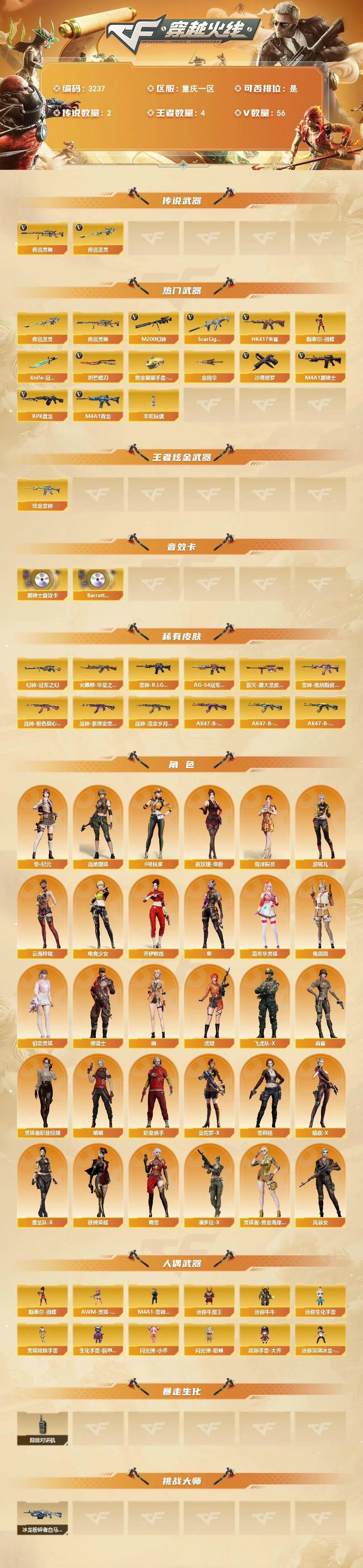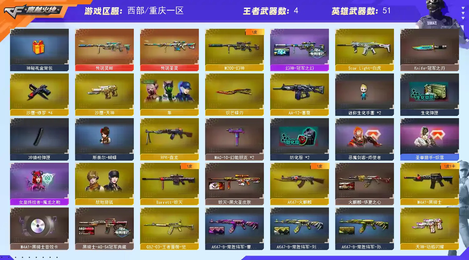 【传说武器】:传说圣灵,传说灵眸【热门武器】:传说圣灵,传说灵眸,Scar Light-白虎,HK417-朱雀,M4A1-青龙,M200-幻神,M4A1-黑骑士,RPK-盘龙,斯泰尔-蝴蝶,羊驼玩偶,沙鹰-修罗*4,Knife-冠军之刃,炽芒蝶刃,黄金猫猫手套-白鲨,金刚伞【王者炫金武器】:炫金雷神【音效卡】:M4A1-黑骑士音效卡,Barrett-碧霄极光音效卡*2【皮肤】:幻神-冠军之幻,雷神-R.LGD-CFPLS18冠军,雷神-维纳斯皮肤,火麒麟-华夏之心,毁灭-黑大圣皮肤,黑骑士-AG-S4冠军典藏,战神-粉色甜心皮肤,战神-紫绶金章皮肤,战神-流金岁月皮肤,AK47-B-常胜将军-曹操,AK47-B-常胜将军-刘备,AK47-B-常胜将军-孙权【角色】:隼,零·纪元,战地猎狐,奇洋探员,乔伊教练,修道士,云海玲珑,暗夜-X,初恋灵狐,电竞少女,飞虎队-X,风暴女,虎妞,嘉年华灵狐,娟娟,0号玩家,灵狐者-黄金海岸,灵狐者-职业经理,麻雀,曼陀罗-X,潘多拉-X,潜龙队-X,蜀雪,铁骑荣耀,兔囡囡,雪莉杨,夜玫瑰-宠粉,幽,游珑儿,职业选手【人偶武器】:M4A1-雷神-精英刀锋,斯泰尔-蝴蝶,AWM-灵狐-15周年嘉年华,迷你牛魔王,迷你牛牛,迷你生化手雷*2,生化手雷-机甲核心*2,闪光弹-小乔,闪光弹-貂蝉,高爆手雷-大乔,迷你深渊冰龙-王绿豆,灵狐娃娃手雷【暴走生化】:超级对讲机【挑战大师】:冰龙粉碎者-白马银枪*2【英雄级武器】:AK47-火麒麟,M4A1-黑骑士,M4A1-死神,AK47-黑武士,AK47-黑鲨,M4A1-青龙,HK417-朱雀,Scar Light-白虎,无影-神兵利器,黑武士-锦绣游龙,超新星-热带奇洋,M4A1-猎神,烈火-动感闪耀,王者之心-觉醒版,AK-47-猩红传说,AK47-B-战神,黑骑士-海王*2,AK47-B-常胜将军,QBZ-03-王者蔷薇-觉醒版,机械迷城-穹宇,AK47-B-身先士卒,AK47-B-战士,Barrett-毁灭,M200-幻神,Barrett-朱雀,Barrett-暗月传说,RPK-盘龙,AA-12-雷霆,沙鹰-修罗*4,沙鹰-天神,天神-动感闪耀,屠龙*2,擎天,炽芒蝶刃,屠龙-动感闪耀,龙啸-热带奇洋,王者之啸-觉醒版,王者之击-觉醒版,龙啸-烈火龙威,高爆手雷-幻灵*2,手雷-动感闪耀,高爆手雷-云龙,手雷-热带奇洋,闪光弹-幻灵*2,闪光弹-云龙,烟雾弹-云龙,M4A1-赤狱骑士,AK47-竞魂无影【道具】:神秘礼盒背包,CFS限定背包,奇洋探员-海龟背包,女皇终结者-背包,炫彩背包,热带奇洋炫彩背包,超级背包,哔哩哔哩名片,圣拳猎手-炽雪,女皇终结者-魔龙之吻,救世主-黑桃战神,黄金生化钩,绿色巨人,灵魂忍者*2,变异宝贝,妖姬,迷雾幽灵*2,生化弹匣,夺命之镰,防化服*2,金色流光-枪王排位*2,星辰流光-枪王排位,流光-再燃火线,枪王排位28赛季金色流光,枪王排位29赛季金色流光,热带奇洋特效,热带奇洋表情,炽雪表情,动感闪耀表情,CFPL选手表情-第1套,EP战队名片,EP战队喷图,EP战队击杀图标*2,防弹头盔*5,防弹衣*5,C4工具钳*4,手雷包*3【特殊枪械】:蝴蝶斯泰尔+0烈龙,1白虎,1黑骑士,1盘龙,1蝴蝶斯泰尔,